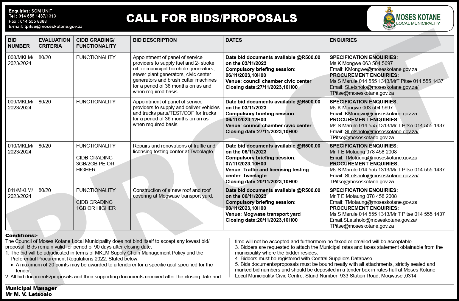 Details Tender Number 009/MKLM/2023/2024 Department Moses Kotane Local Municipality Tender Type Request for Bid(Open-Tender) Province North West Date Published 27 October 2023 Closing Date 27/11/2023 10 00 Place where goods, works or services are required Moses Kotane Local Municipality Mogwase Mogwase 0314 Special Conditions N/A ENQUIRIES Contact Person Ms K. Mongwe Email Kmongwe@moseskotane.gov.za Telephone number 063-504-5697 FAX Number N/A BRIEFING SESSION Is there a briefing session? Yes Is it compulsory? Yes Briefing Date and Time 06/11/2023 12 00 Briefing Venue Moses Kotane Local Municipality, council chamber, Mogwase TENDER DOCUMENTS Tshwantshiso Moses Kotane TENDER FOR27OCT2023 171 mm X 8COL.png
