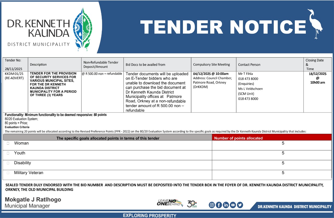 Tender for the provision of security services for various municipality sites,for the Dr Kenneth Kaunda District Municipality for a period of three (3) years.