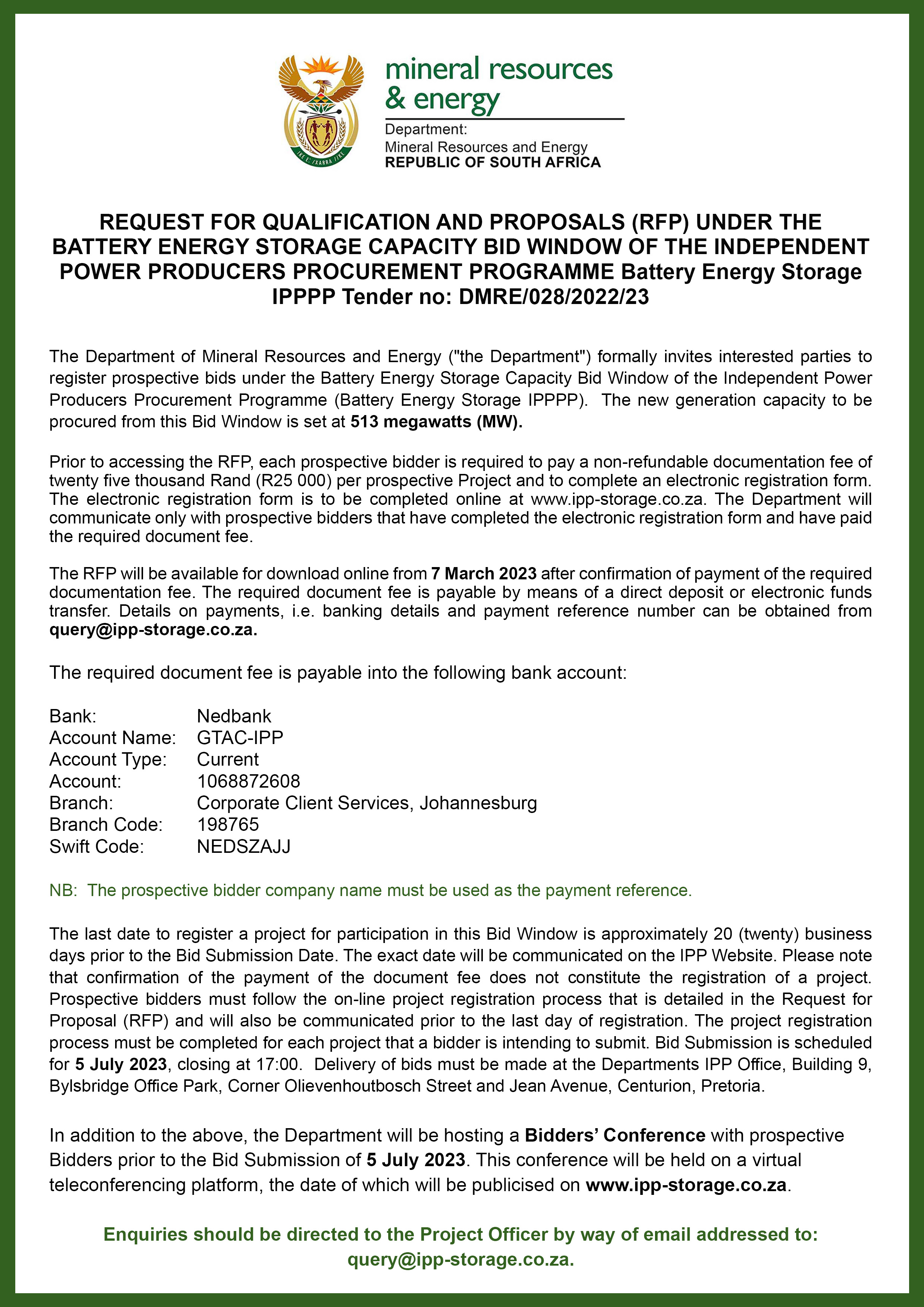 REQUEST FOR QUALIFICATION AND PROPOSALS (RFP) UNDER THE BATTERY ENERGY STORAGE CAPACITY BID WINDOW OF THE INDEPENDENT POWER PRODUCERS PROCUREMENT PROGRAMME Battery Energy Storage IPPPP Tender no DMRE/028/2022/23