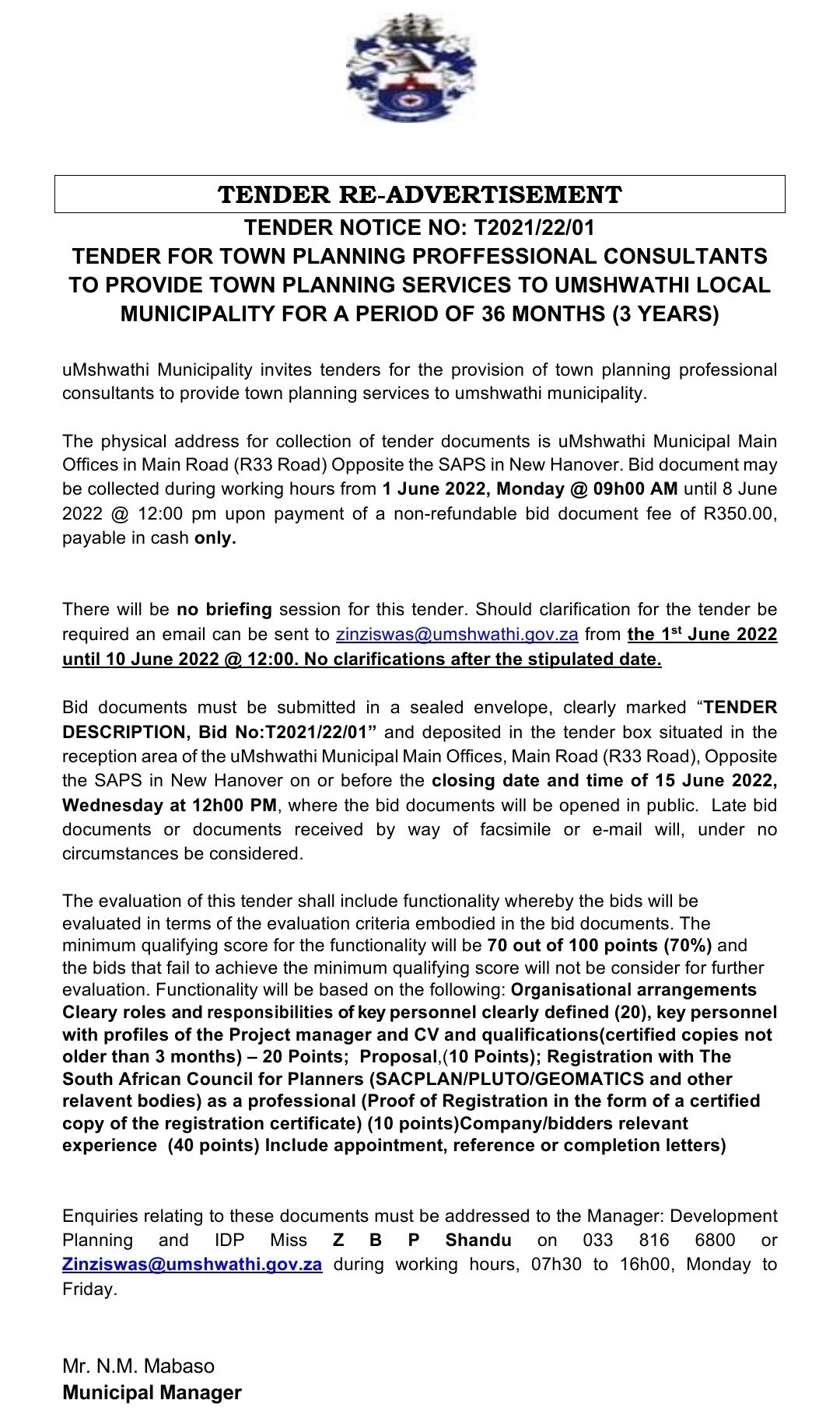 Department uMshwathi local Municipality Tender Type Request for Bid(Open-Tender) Province KwaZulu-Natal Date Published Wednesday, 01 June 2022 Closing Date Wednesday, 15 June 2022 - 12 00 Place where goods, works or services are required New Hanover Main Road opposite New Hanover Police Station - New Hanover - New Hanover - 3230 Special Conditions N/A ENQUIRIES Contact Person Miss. Z. Shandu Email zinziswas@umshwathi.gov.za Telephone number 033-816-6800 FAX Number 033-502-2850 BRIEFING SESSION Is there a briefing session? NO Is there a briefing session? Is it compulsory? NO Is it compulsory? Briefing Date and Time Briefing Venue N/A