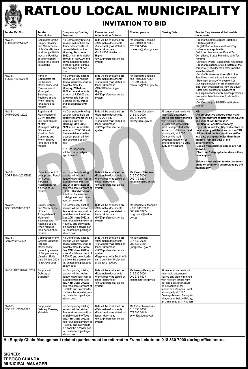 Department Ratlou Local Municipality Tender Type Request for Bid(Open-Tender) Province North West Date Published Wednesday, 08 June 2022 Closing Date Tuesday, 12 July 2022 - 11 00 Place where goods, works or services are required Ratlou Local Municipality - Setlagole Village - Setlagole - 2773 Special Conditions N/A ENQUIRIES Contact Person Karabo Matlhoko Email karabo@ratlou.gov.za Telephone number 066-472-9253 FAX Number 018-330-7047 BRIEFING SESSION Is there a briefing session? NO Is there a briefing session? Is it compulsory? NO Is it compulsory? Briefing Date and Time Briefing Venue N/A