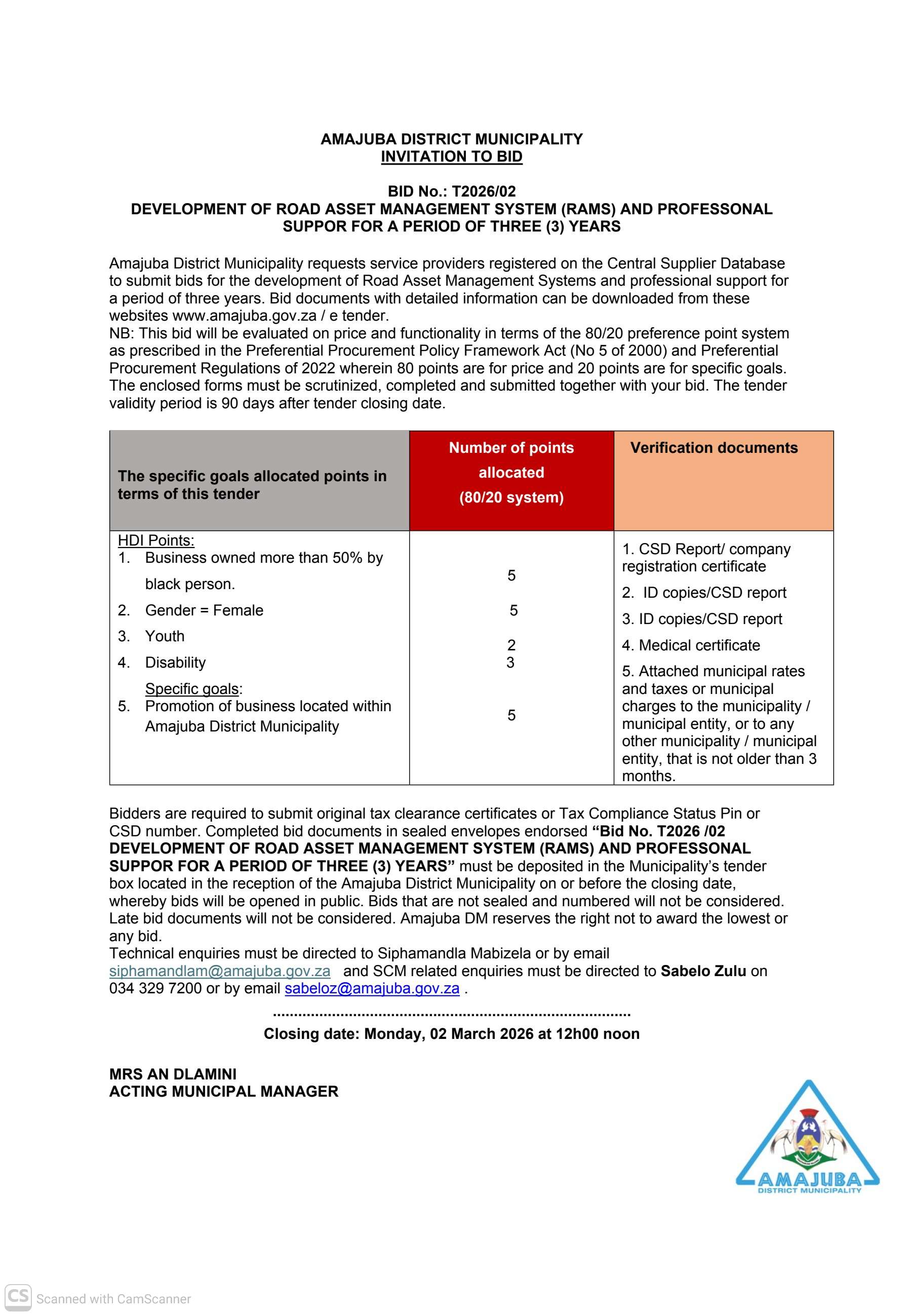 Details Tender Number T2026/02 Organ Of State Amajuba District Municipality Tender Type Request for Bid(Open-Tender) Province Kwa-Zulu Natal Date Published 31 January 2026 Closing Date 02 March 2026 12 00 Place where goods, works or services are required B9356 AMAJUBA ROAD, SECTION 1`-MADADENI-Newcastle -2951 Special Conditions N/A ENQUIRIES Contact Person Siphamandla Mabizela Email siphamandlam@amajuba.gov.za Telephone number 034-329-7200 FAX Number N/A BRIEFING SESSION Is there a briefing session? No Is it compulsory? No Briefing Date and Time N/A Briefing Venue N/A TENDER DOCUMENTS T202602(1).jpg Date Uploaded 2026-01-31