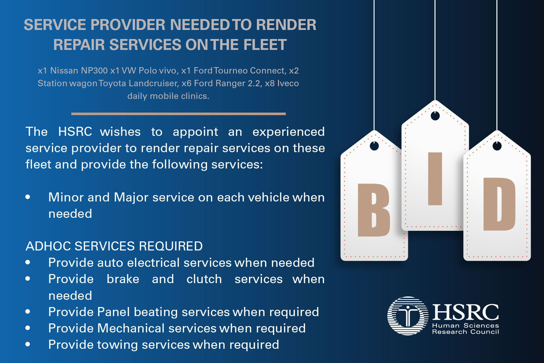 Details Tender Number 20260309 Organ Of State Human Sciences Research Council Tender Type Request for Quotation Province Gauteng Date Published 9 March 2026 Closing Date 17 March 2026 16 00 Place where goods, works or services are required Old Bus Depot, Mbubu Road, -Sweetwaters-Pietermaritzburg-4041 Special Conditions N/A ENQUIRIES Contact Person Phumlani Ndlovu Email PNdlovu@hsrc.ac.za Telephone number 012-302-2160 FAX Number N/A BRIEFING SESSION Is there a briefing session? No Is it compulsory? No Briefing Date and Time N/A Briefing Venue N/A TENDER DOCUMENTS BID.pdf Date Uploaded 2026-03-09 BID.jpg Date Uploaded 2026-03-09